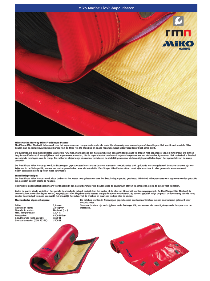 De FlexiShape Miko Plaster® is bedoeld als tijdelijke en snelle reparatie van beschadigingen aan de romp van het schip veroorzaakt door een aanvaring of het aan de grond lopen. Het wordt met behulp van de MIKO FIX aan de romp vastgemaakt.