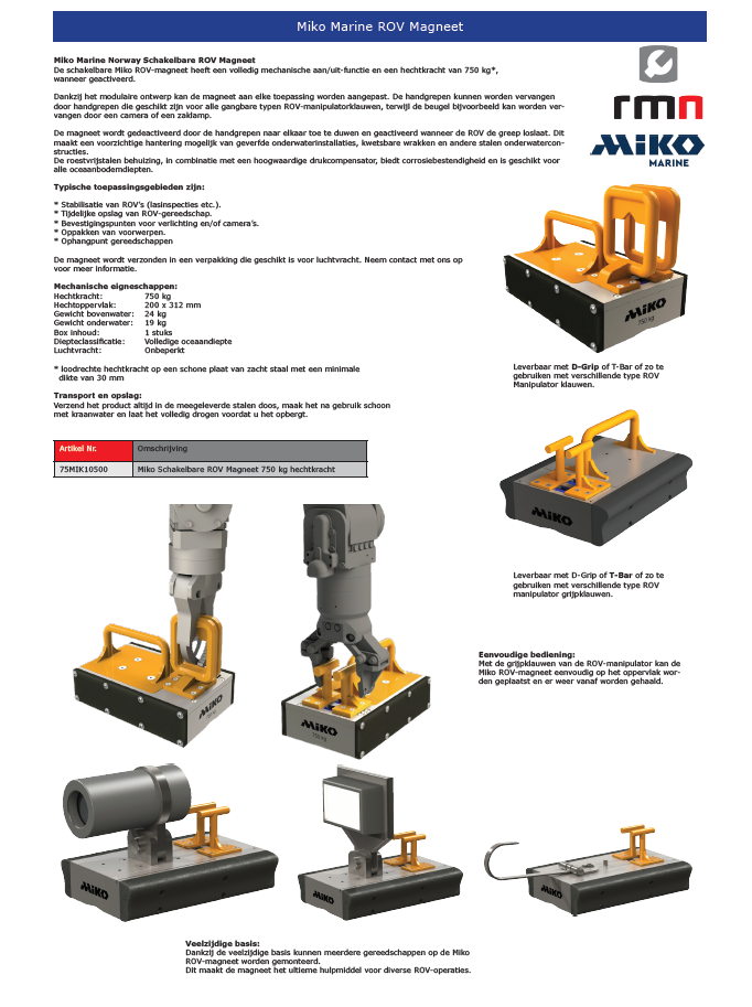 De schakelbare Miko ROV magneet heeft een volledig mechanisch aan/uit schakeling en een hechtkracht van 750 kg* bij activatie. De afschuifkracht is afhankelijk van de condities van het oppervlak. Als vuistregel is dit ca. 1/3 afschuifkracht naar de hechtkracht verhouding (wrijvingscoëfficiënt).