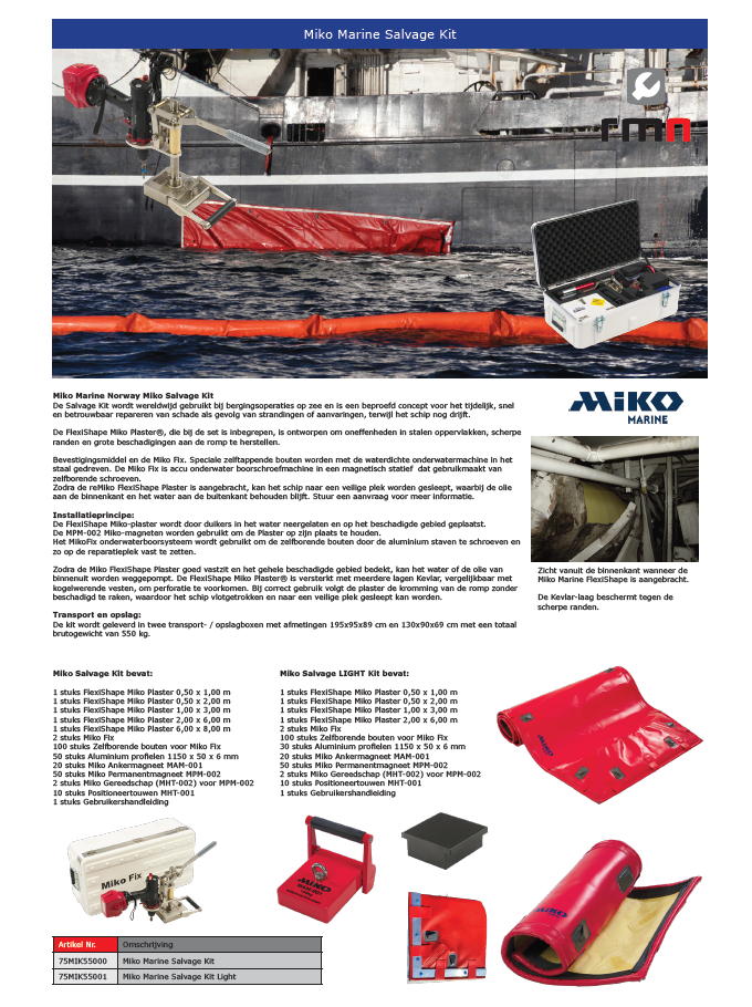 Wereldwijd gebruikt voor marine bergingsoperaties is de Miko Marine Bergingskit een bewezen concept voor het tijdelijk en snel repareren van schade na een aanvaring of het aan de grond lopen van een schip.