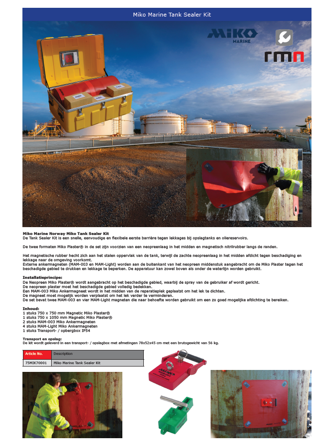 De Miko Marine Tank Sealer Kit in combinatie met de Miko Marine Pipe Sealer Kit dient als een uitgebreid hulpmiddel om zo paraat te zijn bij het voorkomen van olielekkage op elke tankopslag of locatie waar een tank aanwezig is en het gevaar is van milieuvervuiling bij eventuele lekkage.