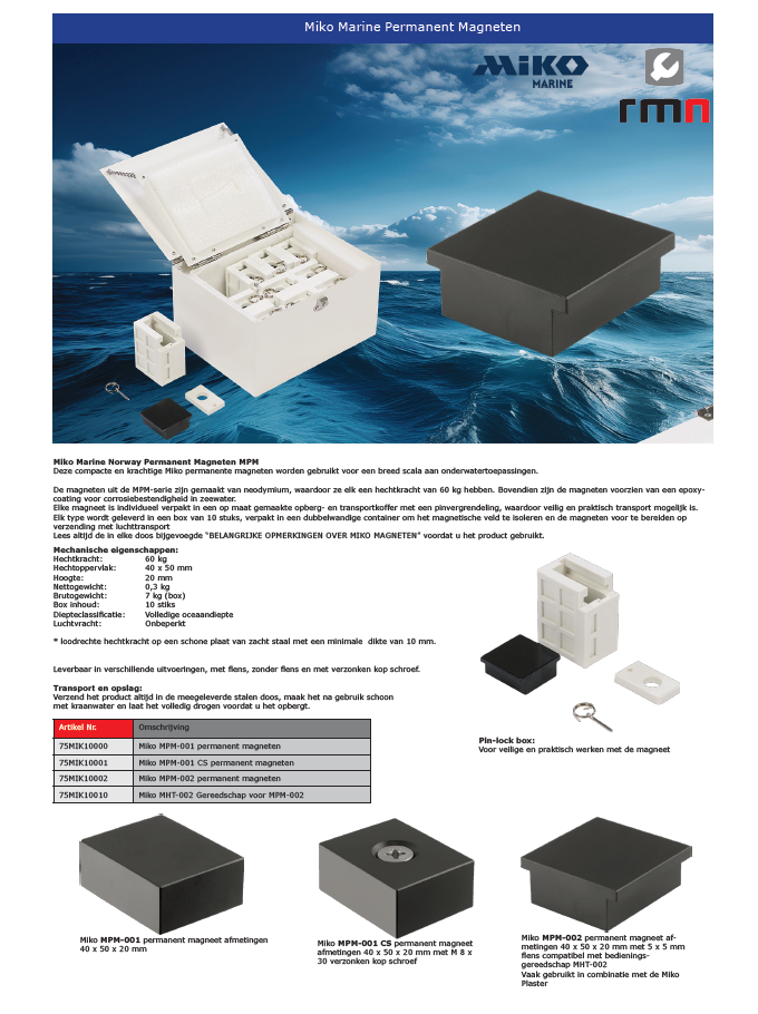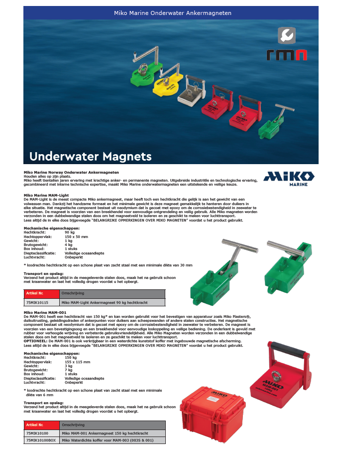 De Miko Marine Compacte Krachtige Permanent Magneten en Ankermagneten vormen een serie krachtige en robuuste fixatiepunten voor onderwater gebruik. Met hechtkrachten van 60 tot 80 kilo voor de Permanent Magneten en 90 tot 2.000 kilo voor de ankermagneten. Deze magneten worden gebruikt voor een groot scala aan toepassingen.
