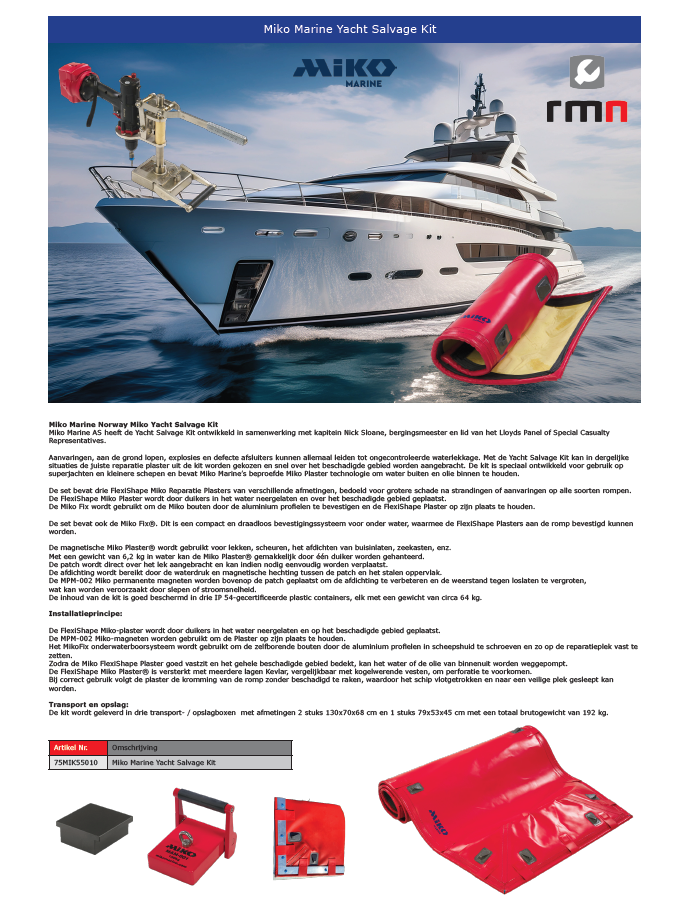 Miko Marine AS heeft de Yacht Salvage Kit ontwikkeld in samenwerking met kapitein Nick Sloane, bergingsmeester en lid van het Lloyds Panel of Special Casualty Representatives.