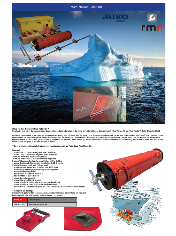 De nieuwe Miko Marine Polar Kit wordt geproduceerd in Noorwegen en bevat een selectie magnetische patches en krachtige ankermagneten die kunnen worden neergelaten en vastgezet op een gebied met rompschade. Miko-patches hebben hun waarde bewezen en worden regelmatig gebruikt over de hele wereld, waar ze sinds de product presentatie in 1997 het zinken van talrijke schepen hebben voorkomen. In geval van nood kan een patch, vervaardigd uit een sterk laminaat met een flexibele magnetische laag, over de beschadigde opening worden neergelaten en waar het blijft kleven als een gigantische koelkastmagneet. De magnetische hechting van de patch, gecombineerd met de waterdruk van buitenaf, sluit het gat en houdt het veilig op zijn plaats. Er kunnen ook extra krachtige ankermagneten worden gebruikt om de afdichting te behouden totdat het schip veilig in de haven ligt.