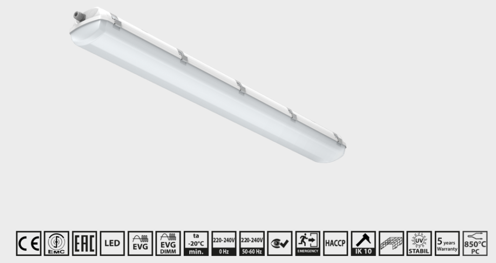 De AQUA-70-LED is een extreem waterdichte LED-armatuur voor veeleisende omgevingen. Met zijn IP-klasse IP66/IP67/IP69 en IP68 is hij bestand tegen onderdompeling tot 15 meter diepte. Er is keuze uit verschillende bevestigingsbeugels in diverse materialen, die apart besteld moeten worden. De armatuur voldoet aan de HACCP-normen en is geschikt voor de voedingsmiddelenindustrie.