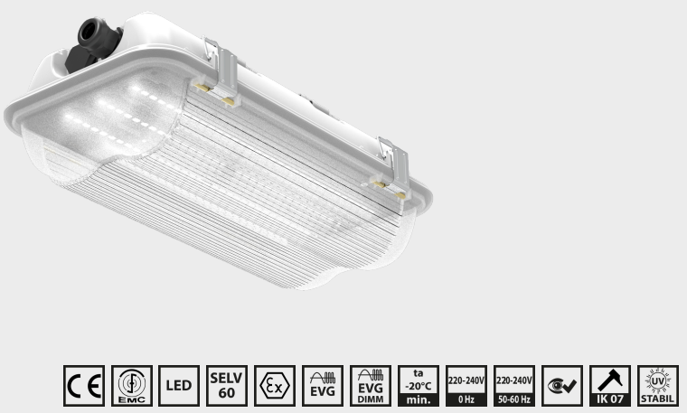 De KERN-Ex1/21 LED is een LED-armatuur voor nood- en vluchtroutes voor ATEX-zone 1, 21. Het armatuur is zeer water- en stofbestendig met een beschermingsgraad van IP66/IP67 en een slagvastheid van IK08. Gemaakt van UV-bestendig polycarbonaat en de opalen diffusers zorgen voor een effectieve lichtverdeling. De armaturen zijn verkrijgbaar in de lichtkleuren 4.000K, 5.000K en 6.500K. Eenvoudige installatie is een groot voordeel. Er zijn diverse opties beschikbaar, van alleen noodverlichting tot 3 uur autonoom met Autotest of DALI-protocol. De LED-armaturen zijn ATEX- en IECEx-gecertificeerd. ATEX-certificaat (FTZU 25 ATEX 00017X) II 2G Ex eb mb IIC T4 Gb (GAS), II 2D Ex tb IIIC T85°C Db (STOF) en IECEx-certificaat (IECEx FTZU 25.0012X) Ex eb mb IIC T4 Gb (GAS), Ex tb IIIC T85°C Db (STOF).