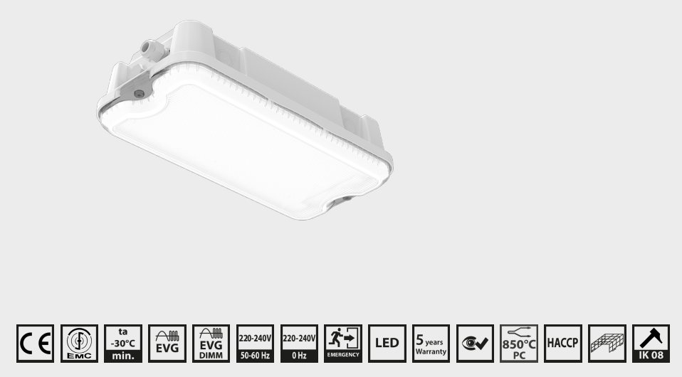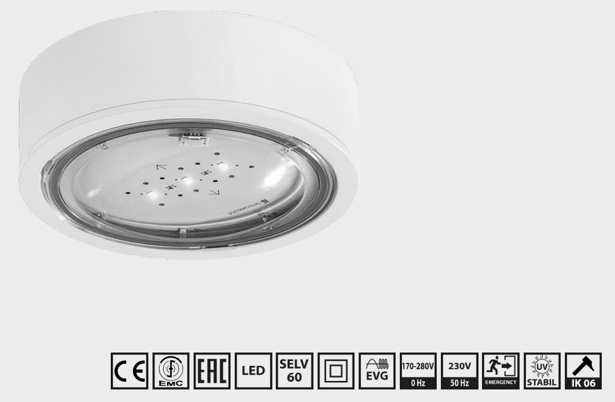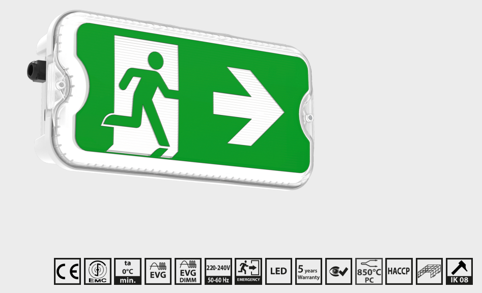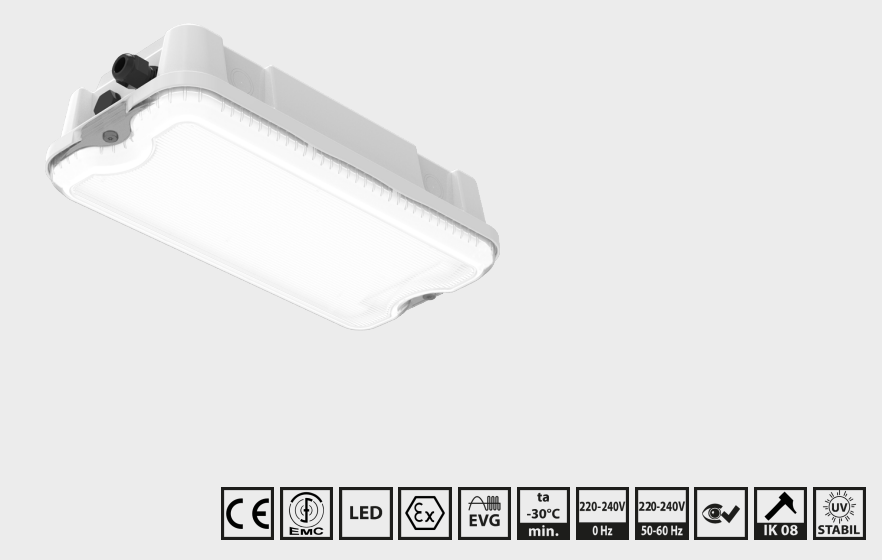 De KERN-Ex-2/21 LED is een nood- en vluchtroute-LED-armatuur voor gebruik in gevaarlijke omgevingen ATEX-zone 2/21. Het is een zeer water- en stofbestendige armatuur met een IP66/IP67-classificatie en een IK08-slagvastheid. ATEX-certificaat (FTZU 25 ATEX 00018X) II 3G Ex nR IIC T6 Gc (GAS), II 2D Ex tb IIIC T85°C Db (STOF), IECEx-certificaat (IECEx FTZU 25.0013X) Ex nR IIC T6 Gc (GAS), Ex tb IIIC T85°C Db (STOF). De nooduitvoeringen worden geleverd met een set pictogrammen. Voor de andere uitvoeringen kunnen de pictogrammen op aanvraag apart worden besteld.