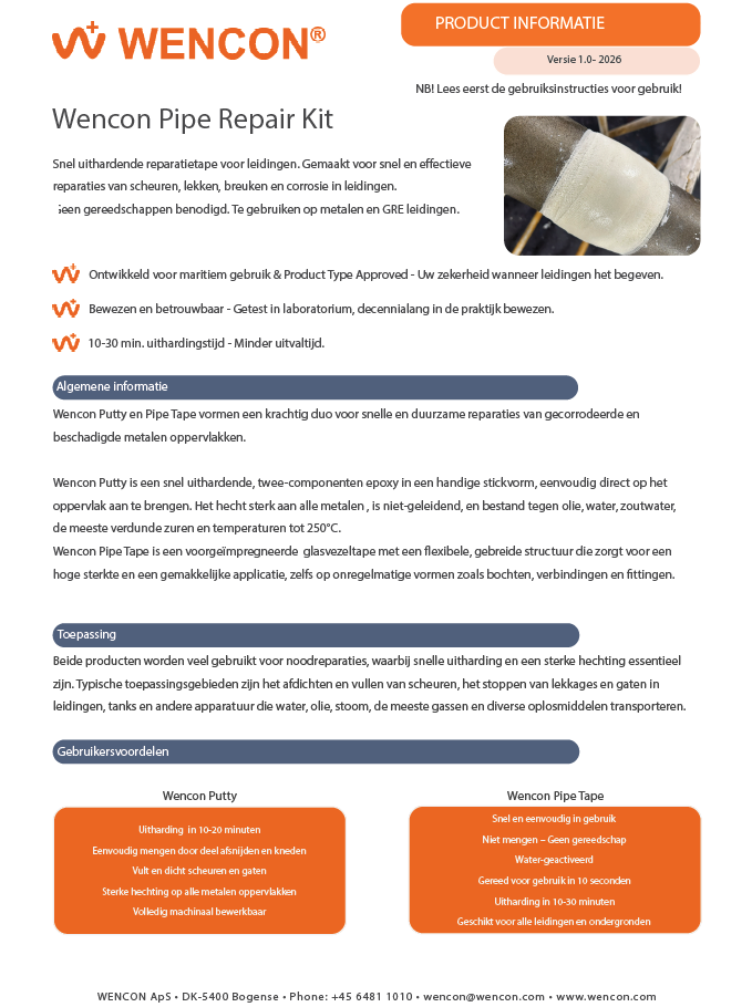 De Wencon Pipe Repair Kit is een fantastisch gereedschap voor snel en eenvoudig repareren van lekkende leidingen. Class Type Approved en Certified producten direct beschikbaar wanneer nodig. Twee verschillende uitvoeringen, de 1047 & 1048. Het Wencon document “Instructies Voor Gebruik” begeleidt u stap-voor-stap door het reparatieproces.