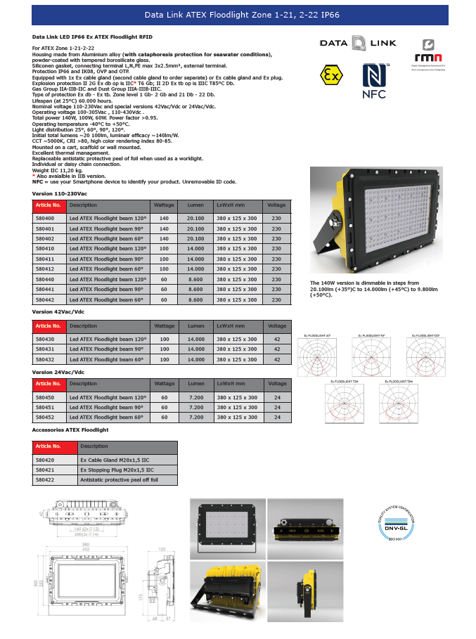 A new developped Data Link ATEX LED Floodlight intended for use in potentially explosive atmospheres of gases, vapors and dust in industries such as refineries, offshore installations, petrochemical industry, chemical industry, pharmaceutical industry, food processing, shipbuilding and mining. All the information of this light fixture can be read out via the NFC system. Normal tags on the outside of the fixture with information about building year, serial number and other information can fade away over the years. Now with this system you can read it out with your Smartphone. The fixture can be ordered in 100-230V 60W (∼8.600 lm), 100W (∼14.000 lm) ( and 140W (∼20.100 lm) version with different light beam angles. Also available in 100W 42Vac/Vdc and 60W 24Vac/Vdc.