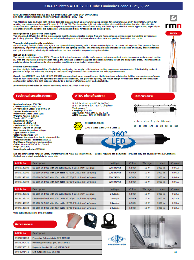 The ATEX LED tube and work light KE-LED-EX 5018 presents itself as a groundbreaking solution for comprehensive 360° illumination, perfect for working in explosion-proof areas (EX zones 1, 2, 21 & 22). This innovative light not only enables all-round illumination, but also offers flexible accessories that open up both fixed and temporary mounting options. With its versatility, the 360° light is ideal for mobile applications, especially in conjunction with the optional silo suspension, which makes it ideal for tank and silo cleaning work.