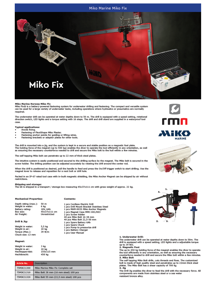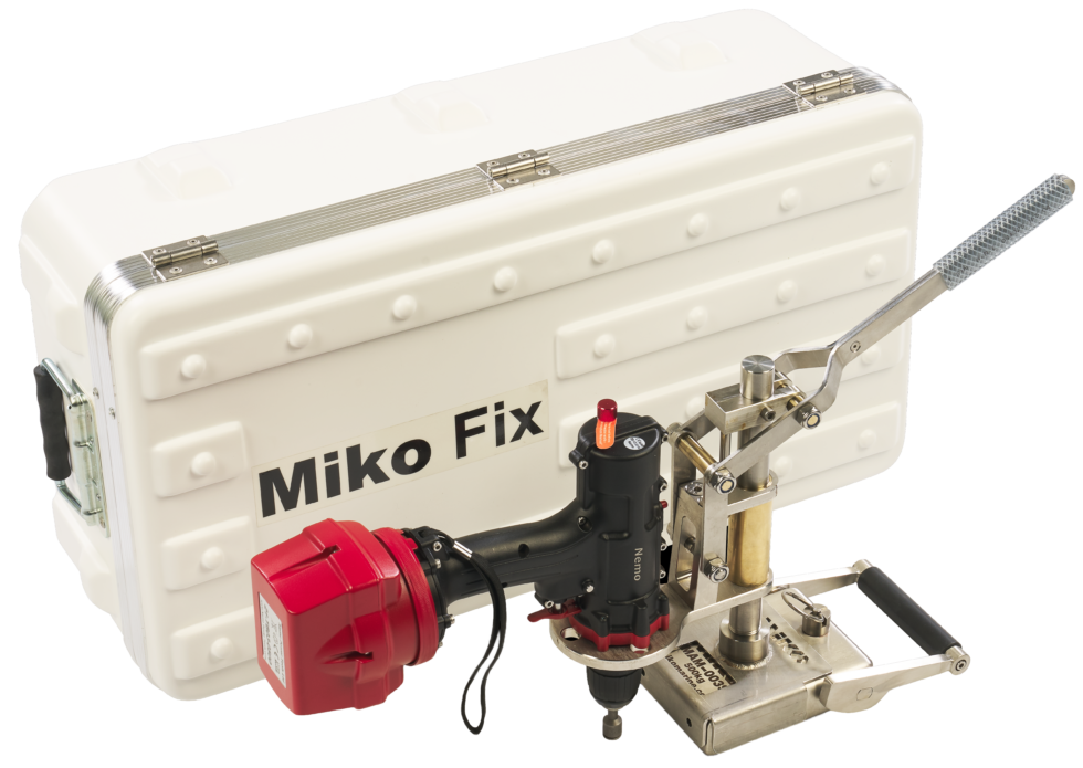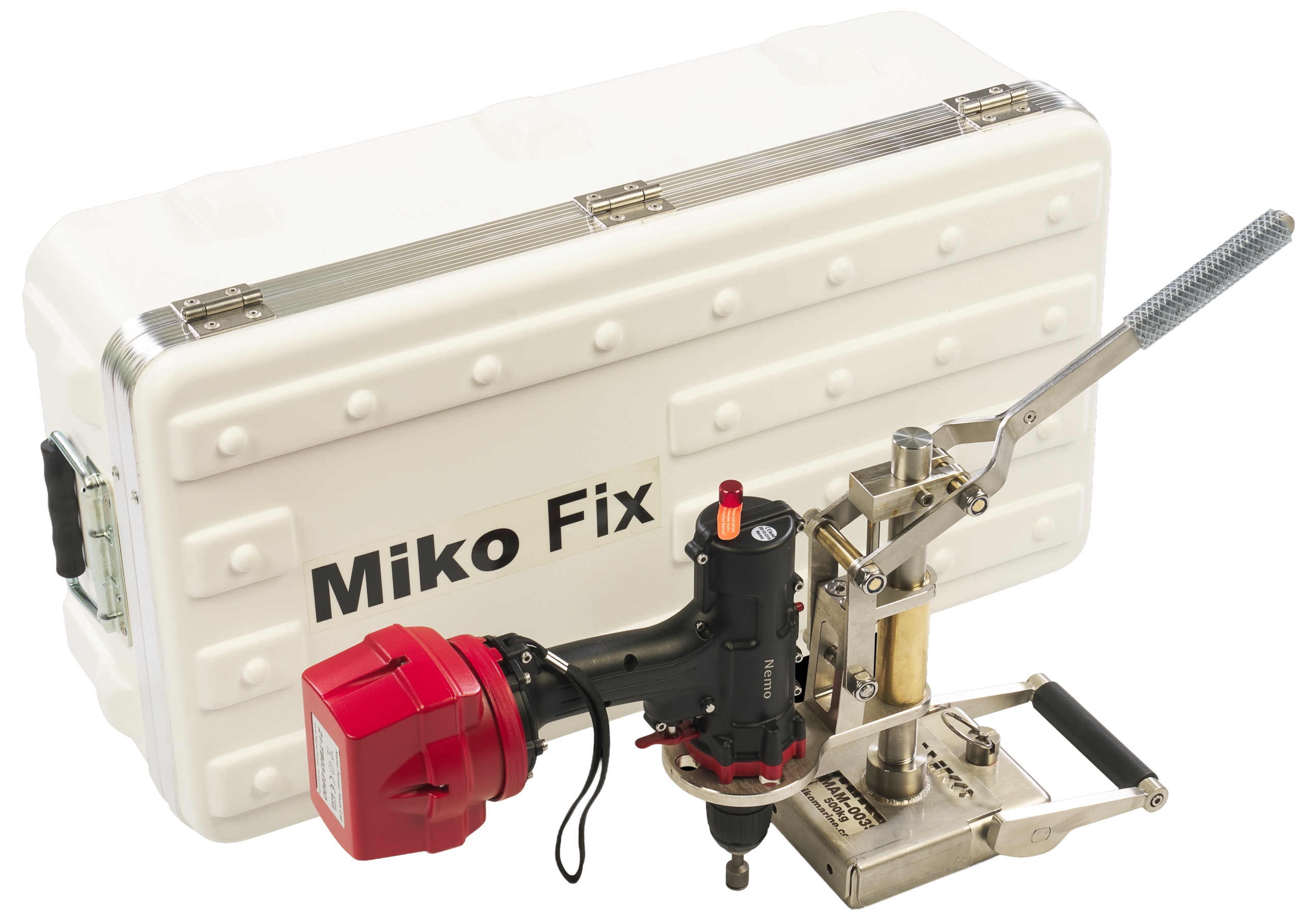 Miko Fix® is a battery operated and cordless fastening system for underwater drilling and fastening. The compact and versatile system can be used for a large variety of underwater tasks, including operations where hydraulics or welding are normally required.