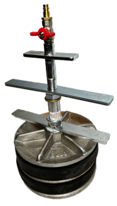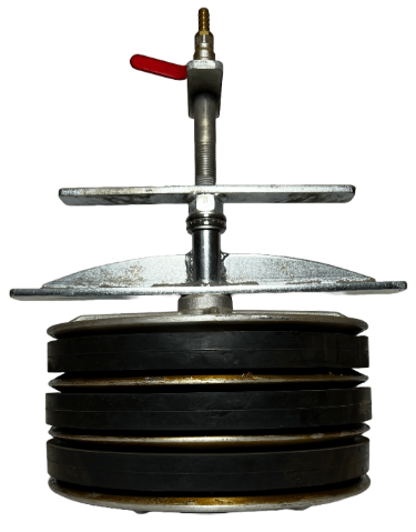 A watertight seal is established against the inside of the pipe by closing the turning bar, pressing the aluminium disks together and expanding the soft rubber rings. The crossbar prevents the plug from being sucked in. The through-bore and valve (exception: Type A) enable the pipe to be flooded before removing the plug.
