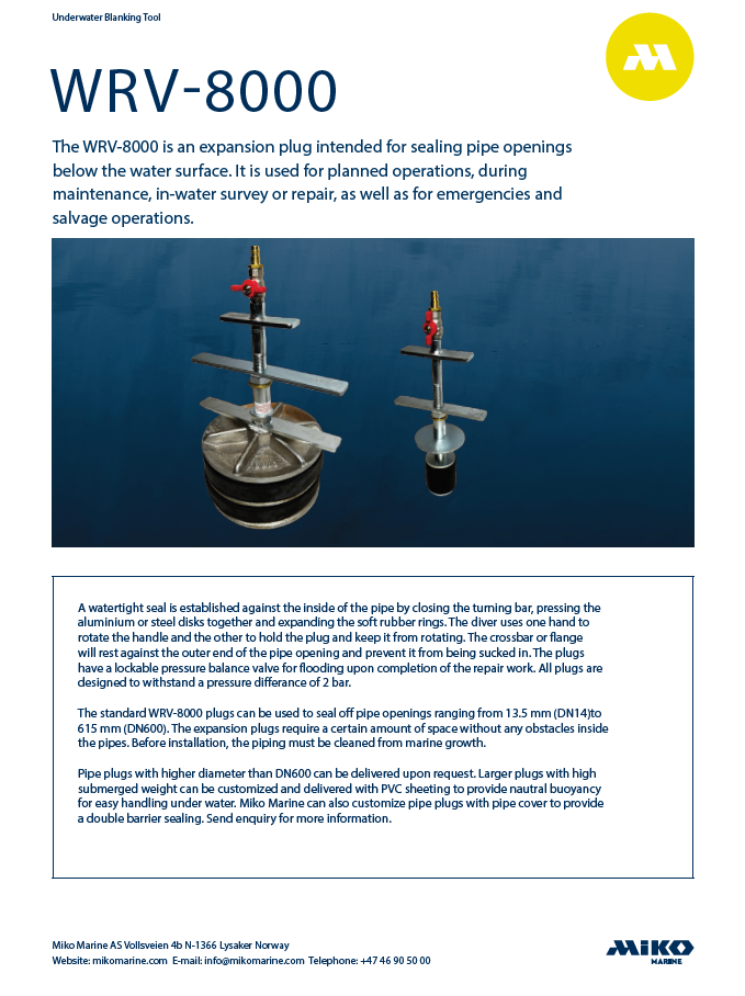 The WRV-8000 is an expansion plug intended for sealing pipe openings below the water surface. It is used for planned operations during maintenance, in-water survey or repair, as well as for emergencies and salvage operations.
