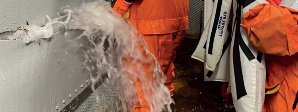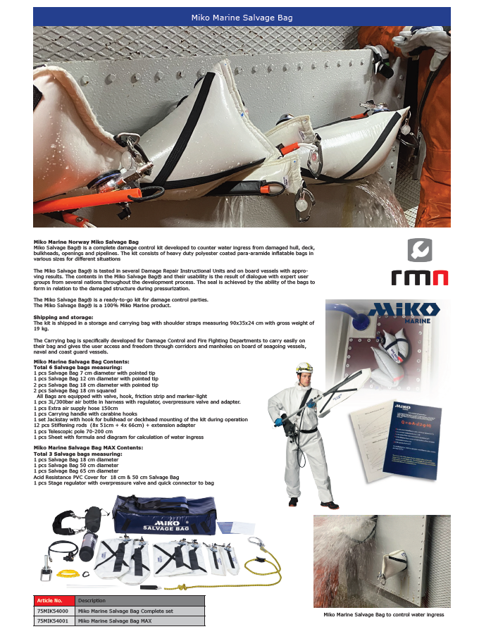 Miko Salvage Bag® is a complete damage control kit developed to counter water ingress from damaged hull, deck, bulkheads, openings and pipelines. The kit consists of heavy duty polyester coated para-aramide inflatable bags in various sizes for different situations