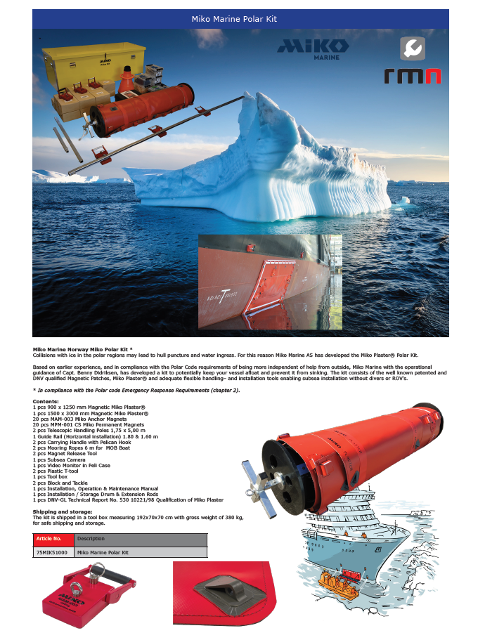Increasing Polar traffic prompted the IMO to introduce the Polar Code in 2017 to increase vessel safety and prevent pollution hazards. Ships certified as conforming to the Code are consequently acknowledged as being prepared and technically equipped for dealing with the Polar environment. To achieve this certification ships must undergo a thorough approvals process. They must be able to demonstrate that the ship and crew can cope with Arctic emergencies and are capable of dealing with any problems they might encounter. The dangers of unexpected ice-damage are such that even Ice Class vessels are at risk and must be able to show an ability to deal with incidents should they arise. Miko believes that the new Polar Kit will help demonstrate this ability.