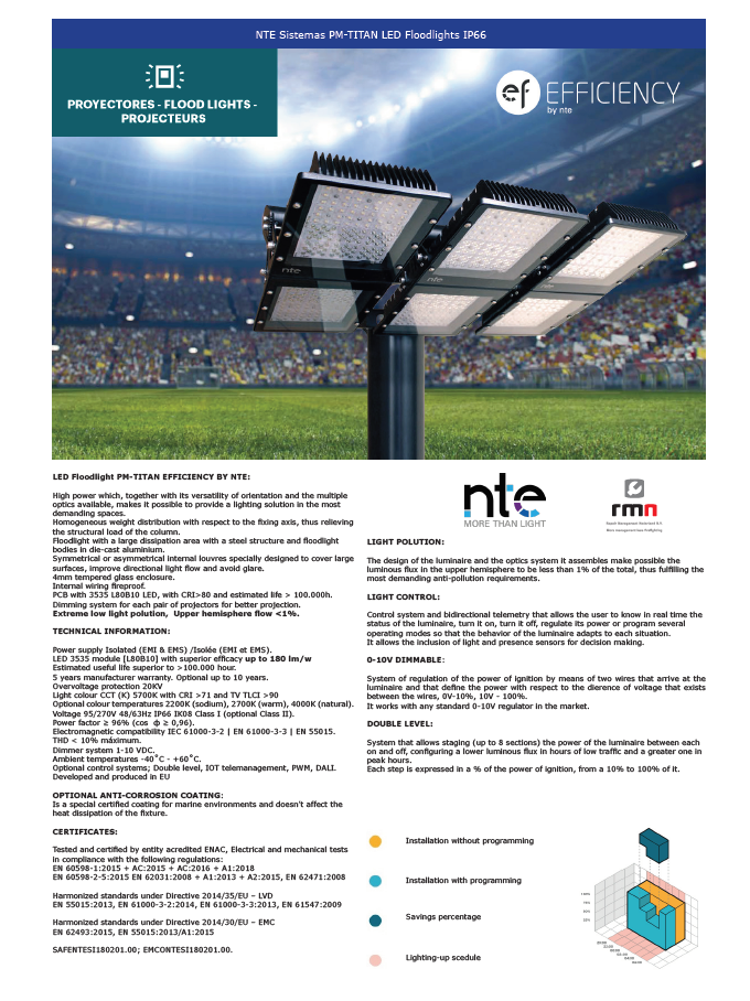 The PM-TITAN is the latest development by NTE in extreme efficient and high output LED Floodlights for sports stadiums, soccer fields and big industrial and harbour areas. The modules are equiped with the new LED 3535 L90B10 with a superior efficacy up to 180 lm/W. Several control options can be ordered for this light fixtures. For this specific light fixture we always provide the customer with a light calculation which meets its requirements.