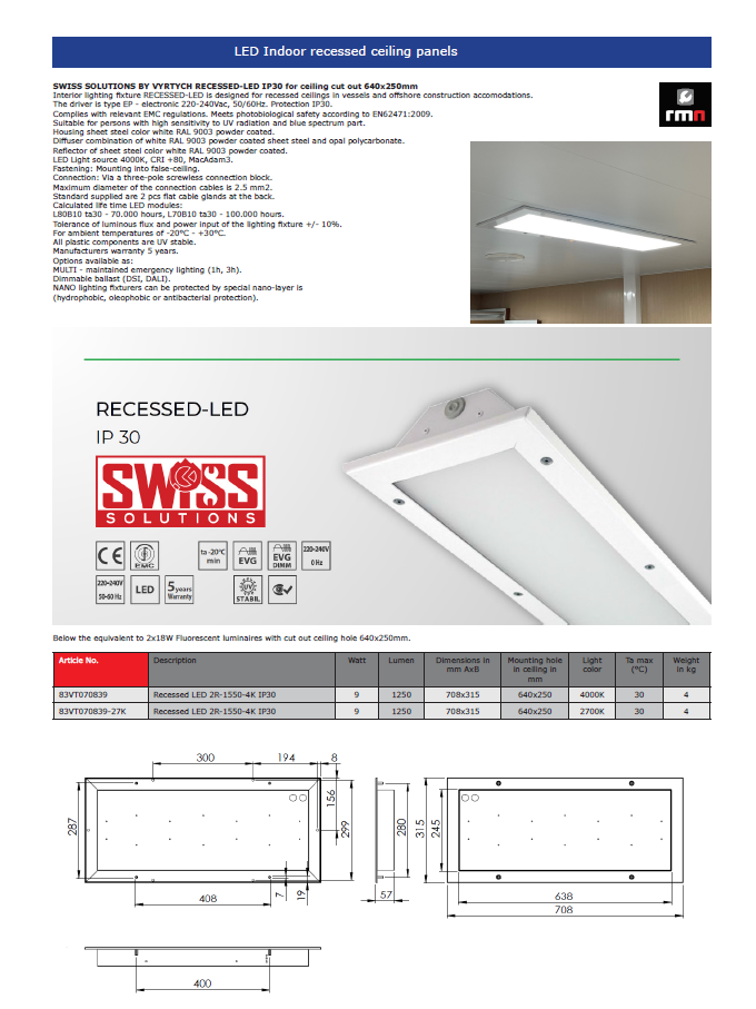 The next development is a range of Recessed Ceiling LED Luminaires designed for the marine and offshore industry. The luminaires are intended to replace the fluorescent luminaires. The luminaires are developed by Vyrtech and RMN. They are only exclusive avaialable for RMN to market under their brand name Swiss Solutions. The luminaires are completely produced in the Czech Republic where there is a state-of-the-art factory and develop center. Vyrtych is producing the complete luminaire in their own factory. The LED drivers they use are produced in the EU and the rest of the components in their own plant.