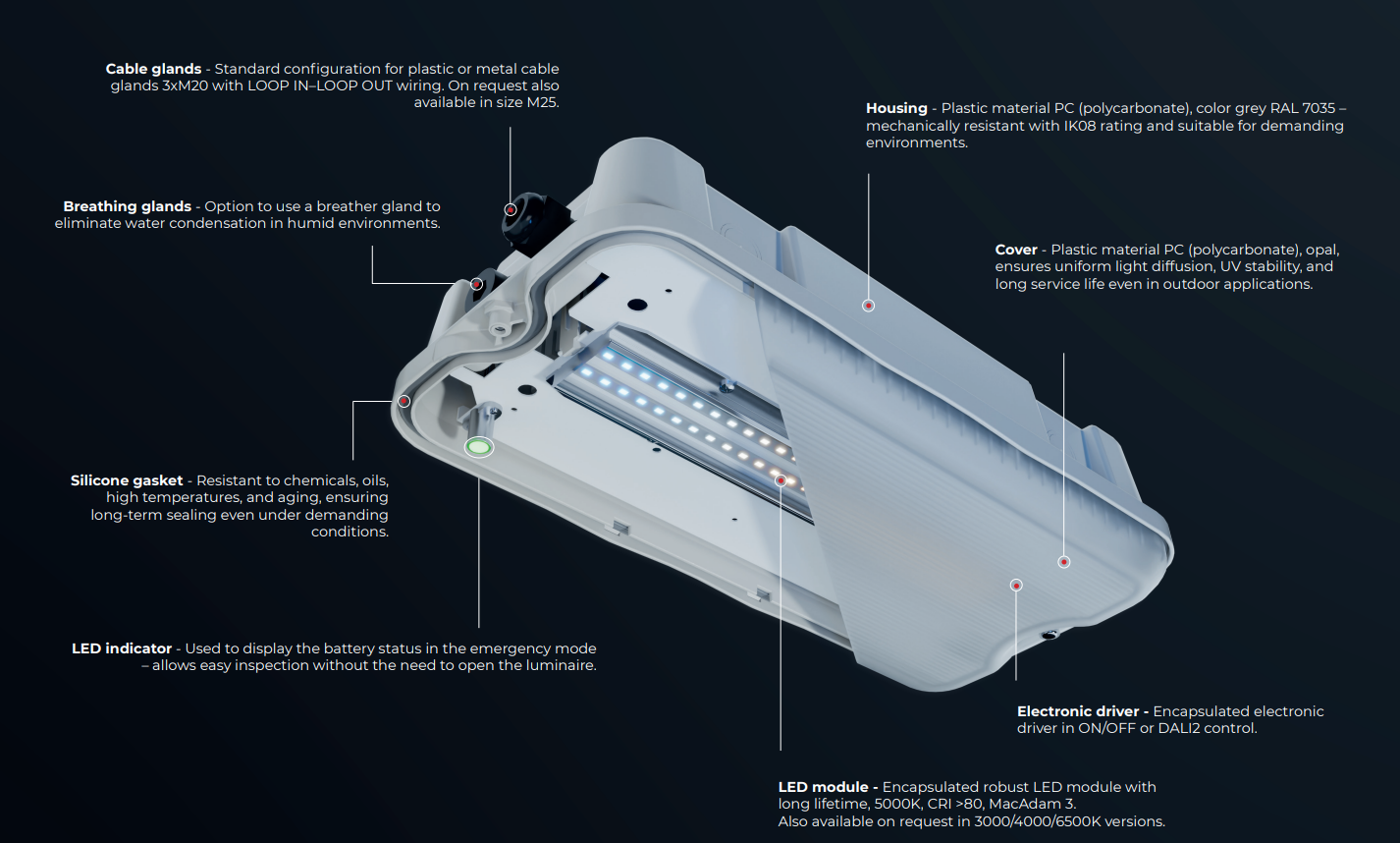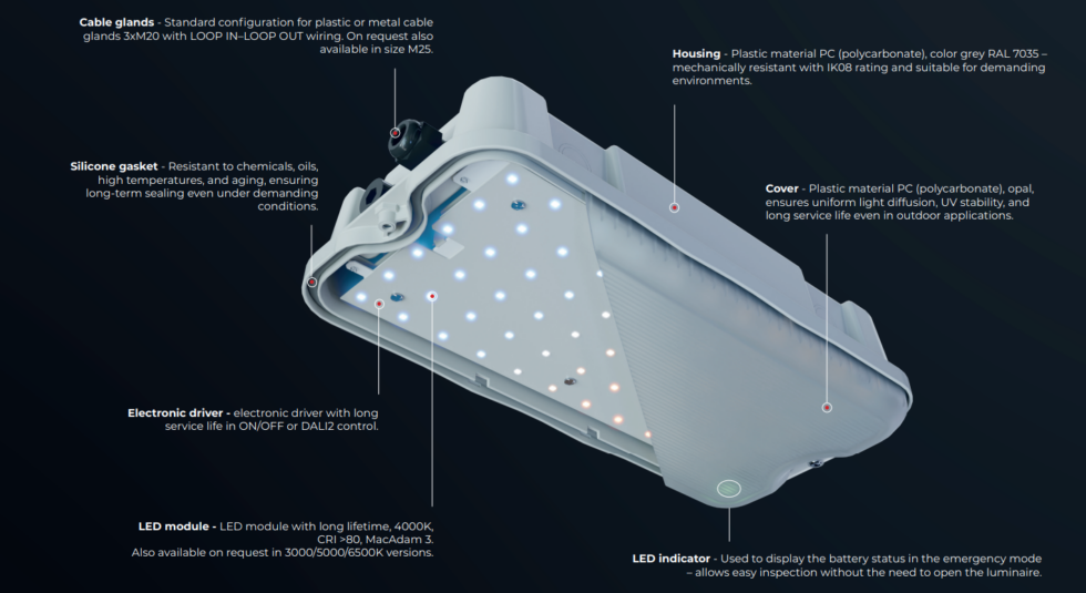 The PALAS-LED is an IP65 Emergency dustproof LED lighting fixture with protection against water jets. The fixture is designed for marking escape routes in indoor areas where resistance to penatration of dust and humidity is required, such as in industrial halls and warehouse areas. Lighting fixtures can be connected in the mode M – maintained emergency lighting as well as CB – Central Battery emergency lighting.