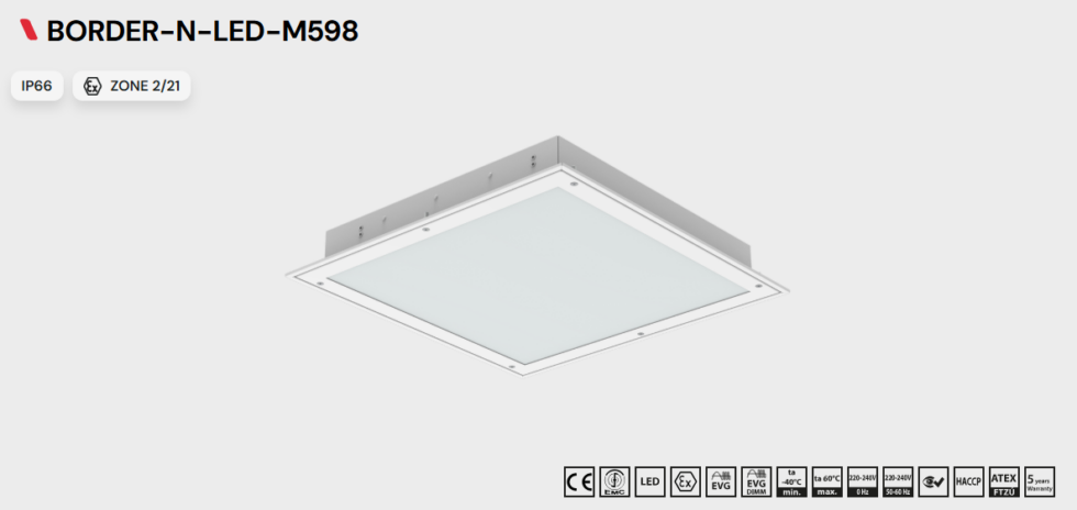 The BORDER-N-LED-M598 2/21 is a recessed LED luminaire designed for explosion hazardous areas for ATEX Zone 2/21 and 22 and is ideal for paint spray booths, Pharma Laboraties, Food and Beverage Production areas, Petrochemical, Chemical Warehouses, Car Industry Workdecks etc. Large luminaire variability with regard to installation – raster ceilings M600/625, metal ceilings M598/M623 or plasterboard or other type ceilings. ATEX Certificate For Zone 2/21 (FTZU 23 ATEX 0038X) Ex II 3G Ex nR IIC T6 Gc (GAS), Ex II 2D Ex tb op is IIIC T85°C Db (DUST). ATEX Certificate For Zone 2/22 (FTZU 23 ATEX 0039X) Ex II 3G Ex nR IIC T6 Gc (GAS), Ex II 3D Ex tb op is IIIC T85°C Db (DUST)The luminaire is Classified for Clean Rooms ISO 14644-1. Is a Silicone-free design.