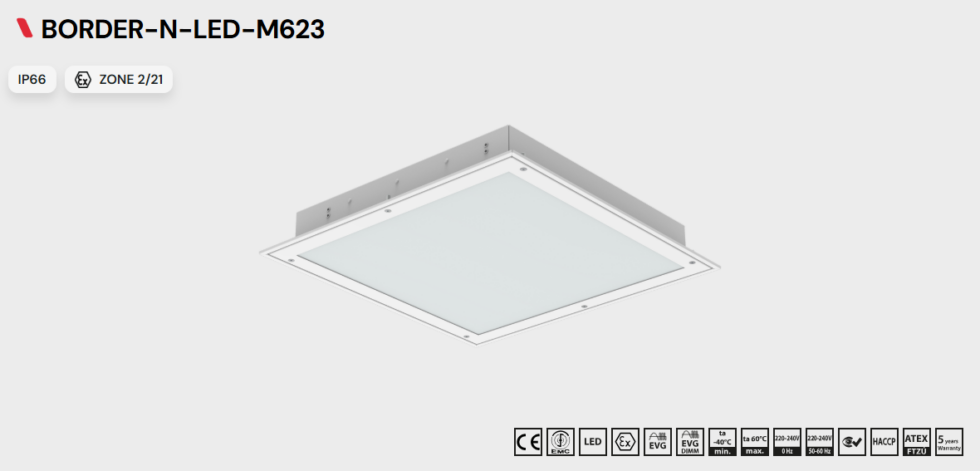 The BORDER-N-LED-M623 2/21 is a recessed LED luminaire designed for explosion hazardous areas for ATEX Zone 2/21 and 22 and is ideal for paint spray booths, Pharma Laboraties, Food and Beverage Production areas, Petrochemical, Chemical Warehouses, Car Industry Workdecks etc. Large luminaire variability with regard to installation – raster ceilings M600/625, metal ceilings M598/M623 or plasterboard or other type ceilings. ATEX Certificate For Zone 2/21 (FTZU 23 ATEX 0038X) Ex II 3G Ex nR IIC T6 Gc (GAS), Ex II 2D Ex tb op is IIIC T85°C Db (DUST). ATEX Certificate For Zone 2/22 (FTZU 23 ATEX 0039X) Ex II 3G Ex nR IIC T6 Gc (GAS), Ex II 3D Ex tb op is IIIC T85°C Db (DUST)The luminaire is Classified for Clean Rooms ISO 14644-1. Is a Silicone-free design.