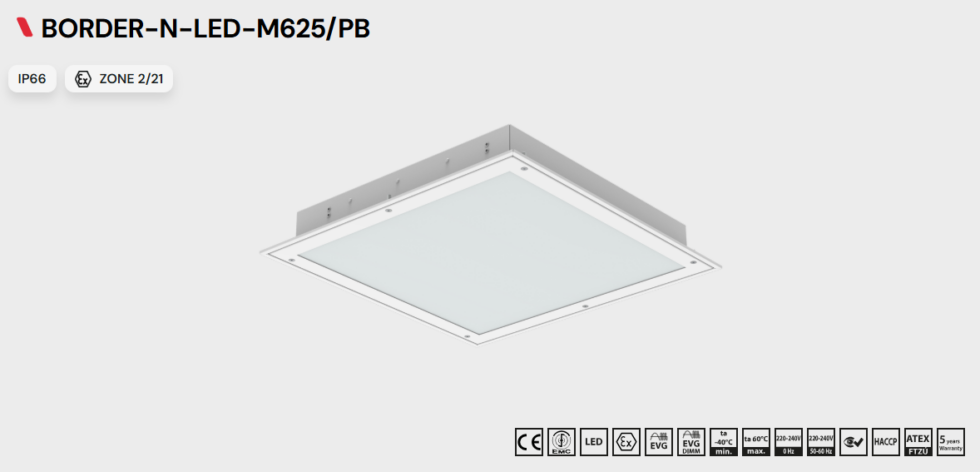 The BORDER-N-LED-M625/PB 2/21 is a recessed LED luminaire designed for explosion hazardous areas for ATEX Zone 2/21 and 22 and is ideal for paint spray booths, Pharma Laboraties, Food and Beverage Production areas, Petrochemical, Chemical Warehouses, Car Industry Workdecks etc. Large luminaire variability with regard to installation – raster ceilings M600/625, metal ceilings M598/M623 or plasterboard or other type ceilings. ATEX Certificate For Zone 2/21 (FTZU 23 ATEX 0038X) Ex II 3G Ex nR IIC T6 Gc (GAS), Ex II 2D Ex tb op is IIIC T85°C Db (DUST). ATEX Certificate For Zone 2/22 (FTZU 23 ATEX 0039X) Ex II 3G Ex nR IIC T6 Gc (GAS), Ex II 3D Ex tb op is IIIC T85°C Db (DUST)The luminaire is Classified for Clean Rooms ISO 14644-1. Is a Silicone-free design.