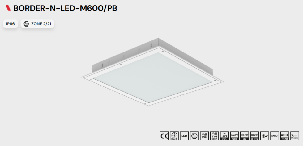 The BORDER-N-LED-M600/PB 2/21 is a recessed LED luminaire designed for explosion hazardous areas for ATEX Zone 2/21 and 22 and is ideal for paint spray booths, Pharma Laboraties, Food and Beverage Production areas, Petrochemical, Chemical Warehouses, Car Industry Workdecks etc. Large luminaire variability with regard to installation – raster ceilings M600/625, metal ceilings M598/M623 or plasterboard or other type ceilings. ATEX Certificate For Zone 2/21 (FTZU 23 ATEX 0038X) Ex II 3G Ex nR IIC T6 Gc (GAS), Ex II 2D Ex tb op is IIIC T85°C Db (DUST). ATEX Certificate For Zone 2/22 (FTZU 23 ATEX 0039X) Ex II 3G Ex nR IIC T6 Gc (GAS), Ex II 3D Ex tb op is IIIC T85°C Db (DUST)The luminaire is Classified for Clean Rooms ISO 14644-1. Is a Silicone-free design.