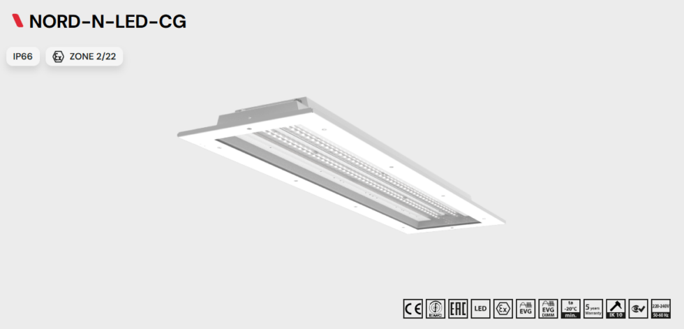 The NORD-N-LED-CG 2/22 is a recessed LED luminaire designed for explosion hazardous areas for ATEX Zone 2/21 and 22 and is ideal for paint spray booths, Pharma Laboraties, Food and Beverage Production areas, Petrochemical, Chemical Warehouses, Car Industry Workdecks etc. The luminaire is designed for direct surface installation or recessed installation. Can be used as standard recessed installation, recessed corner installation, recessed diagonal installation, surface installation (horizontal and vertical as well). Multiple light colours are possible. ATEX Certificate (FTZU 17 ATEX 0026X) Ex II 3G Ex nR IIC T6 Gc (GAS), Ex II 3D Ex tb op is IIIC T63°C Db (DUST). The luminaire is Classified for Clean Rooms ISO 14644-1. Is a Silicone-free design.