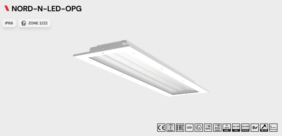 The NORD-N-LED-OPG 2/22 is a recessed LED luminaire designed for explosion hazardous areas for ATEX Zone 2/21 and 22 and is ideal for paint spray booths, Pharma Laboraties, Food and Beverage Production areas, Petrochemical, Chemical Warehouses, Car Industry Workdecks etc. The luminaire is designed for direct surface installation or recessed installation. Can be used as standard recessed installation, recessed corner installation, recessed diagonal installation, surface installation (horizontal and vertical as well). Multiple light colours are possible. ATEX Certificate (FTZU 17 ATEX 0026X) Ex II 3G Ex nR IIC T6 Gc (GAS), Ex II 3D Ex tb op is IIIC T63°C Db (DUST). The luminaire is Classified for Clean Rooms ISO 14644-1. Is a Silicone-free design.