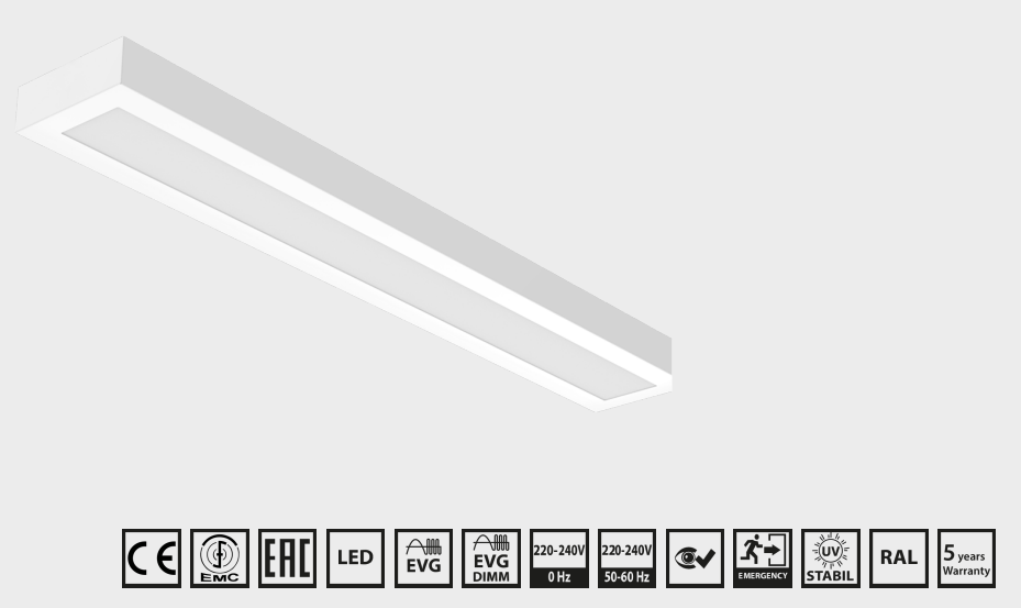 A range of Interior lighting fixtures designed shops, corridors, changing rooms, toilets and technical rooms. Available as surface wall or ceiling mounting, suspension by means of cable suspenders or mounting in false-ceiling modules 600x600mm or in plaster ceilings.