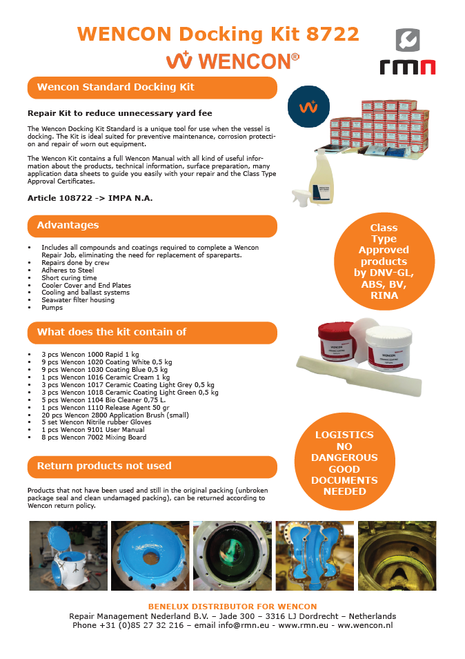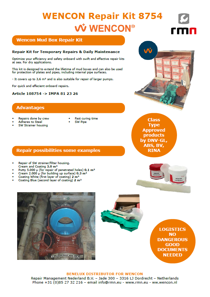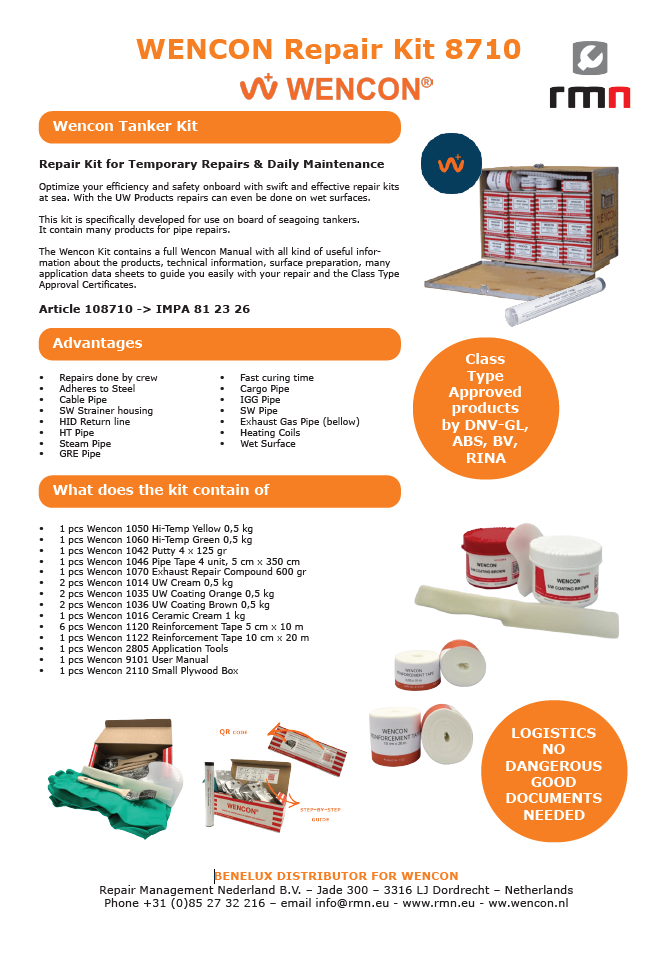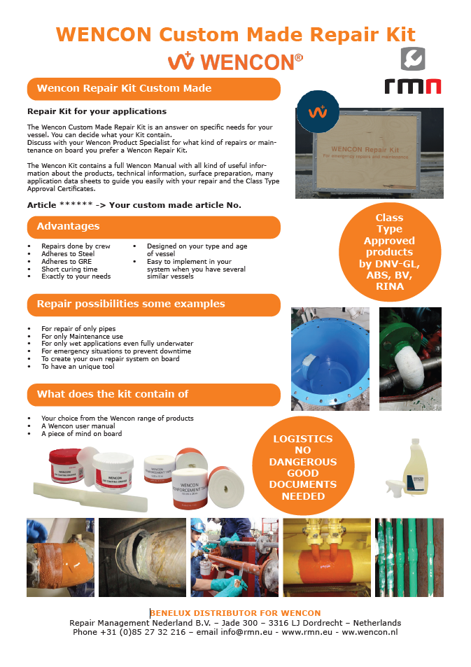 The standard kits shown here have been designed to meet the needs of most ships and offshore rigs. The contents of Wencon Repair Kits can also be customised to fulfil your precise preferences and requirements. For Tankers and Drybulk vessels Wencon developed specific Wencon Repair and Maintenance Kits.