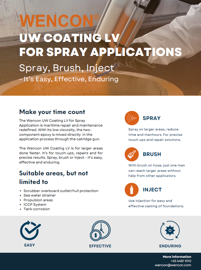 Wencon UW Coating LV is an excellent liquid coating for spray and brush applications. It is based on the high quality Wencon UW Coating but specifically developed for larger applications. The Wencon UW Coating LV is essentially identical to Wencon UW Coating. Its low viscosity allows it to be presented in cartridges, providing the following advantages:
