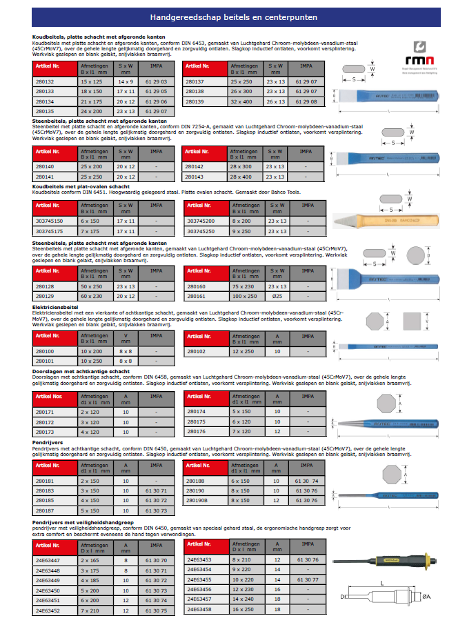 Koudbeitels, ritsbeitels, centerpunten, doorslagen en pendrijvers. Leverbaar in verschillende maten en als set. Alles van Duits fabricaat, of van Bahco en Ega Master.