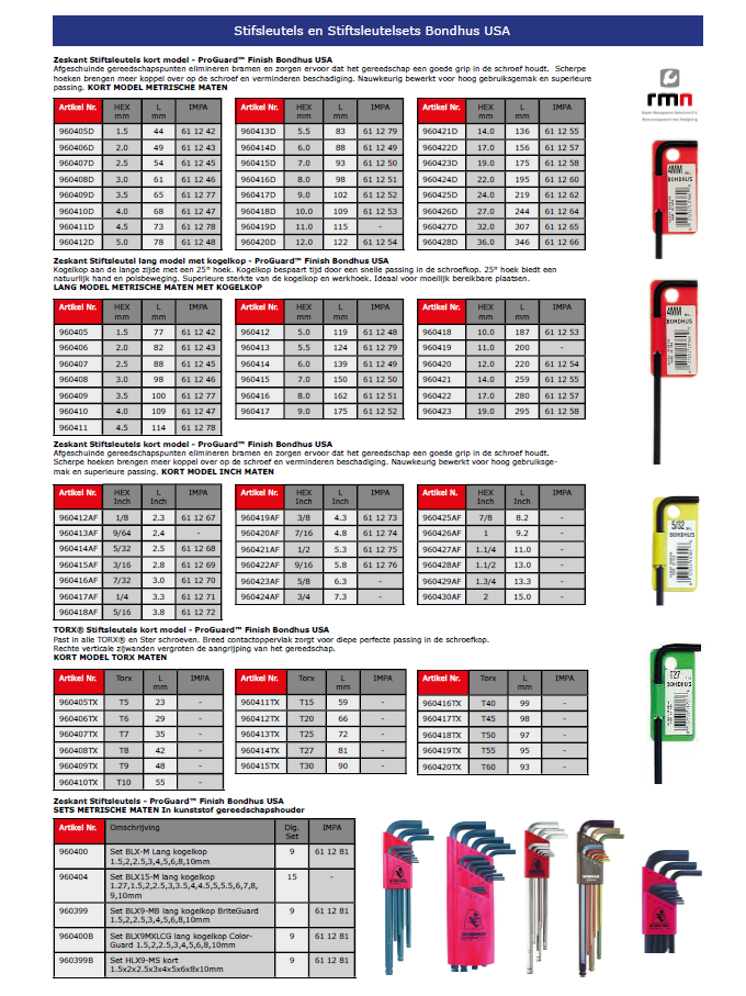 Het is van belang om de juiste handgereedschappen te gebruiken bij het uitvoeren van werkzaamheden. Niet alleen vanuit veiligheidsoogpunt maar ook om precies en zonder overbodige inspanningen te kunnen werken. Veel productie werkzaamheden komen herhalend voor wat een risico op RSI geeft. Speciaal om deze risico’s tegen te gaan en dus ziekteverzuim te voorkomen zijn er steeds meer handgereedschappen ontwikkeld met een ergonomisch design. Zonder een goed stuk gereedschap is het niet eenvoudig om reparatie- of onderhoudswerk goed uit te voeren. RMN biedt een compleet aanbod van handgereedschappen van gerenommeerde fabrikanten.