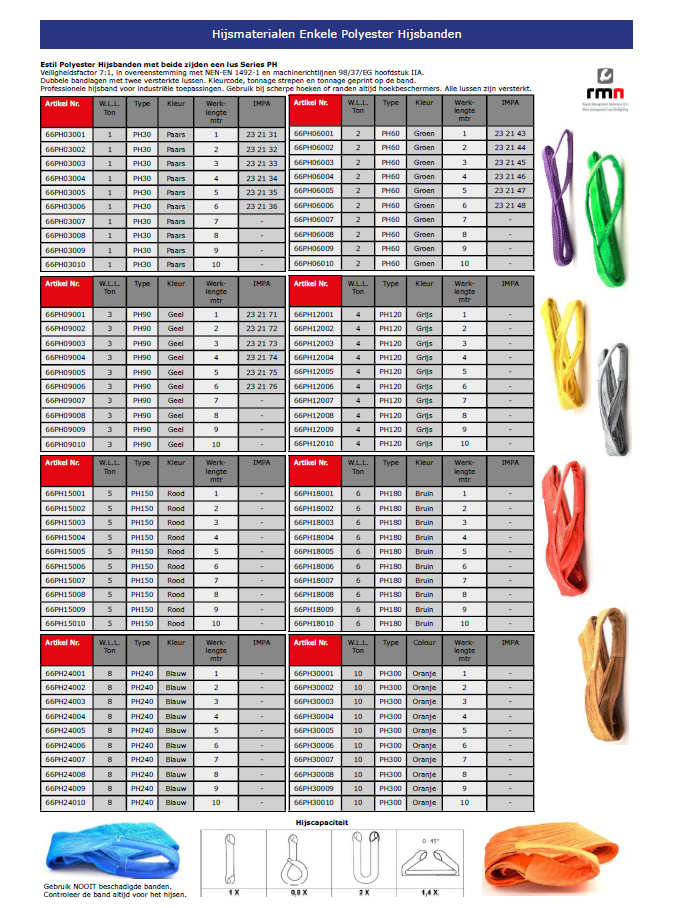 Verkrijgbaar van 1 tot 10 ton in veel verschillende lengtes. Allemaal volgens NEN-EN 1492-1 met een veiligheidsfactor van 7:1. Beschermhoezen in diversen afmetingen leverbaar voor bescherming van hijsbanden en rondstroppen bij scherpe randen aan het te hijsen object.