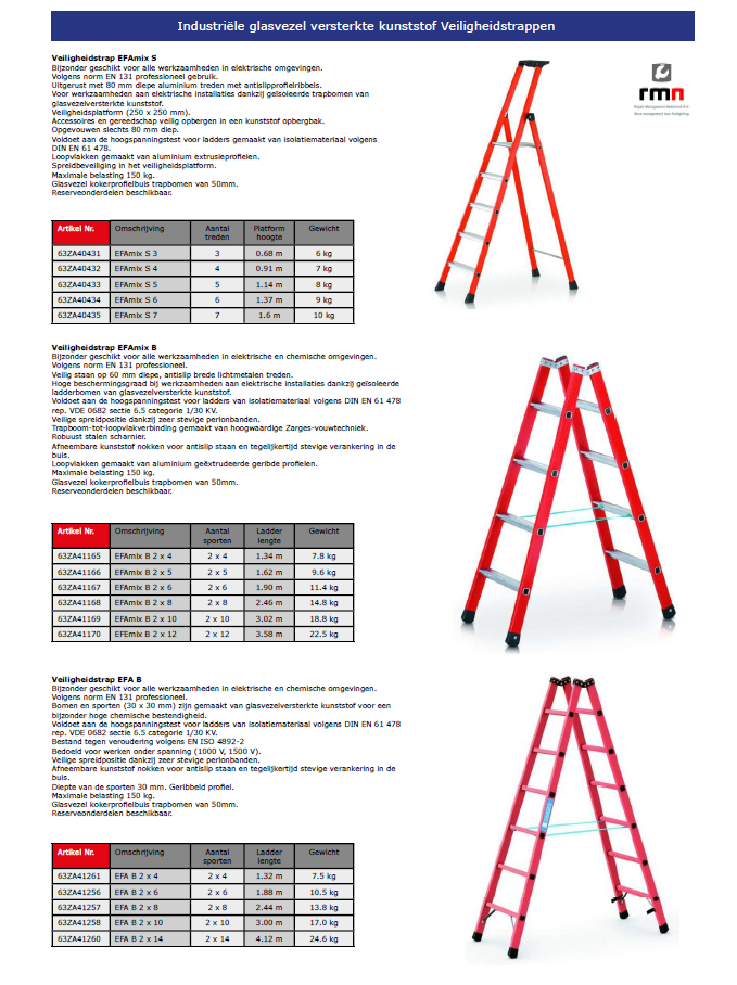 Een compleet aanbod aan veiligheidsladders en veiligheidstrappen voor gebruik in omgevingen waar met chemicaliën wordt gewerkt en voor werken aan elektrotechnische installaties. Alles in overeenstemming met de hoog-voltage richtlijnen voor klimmaterialen