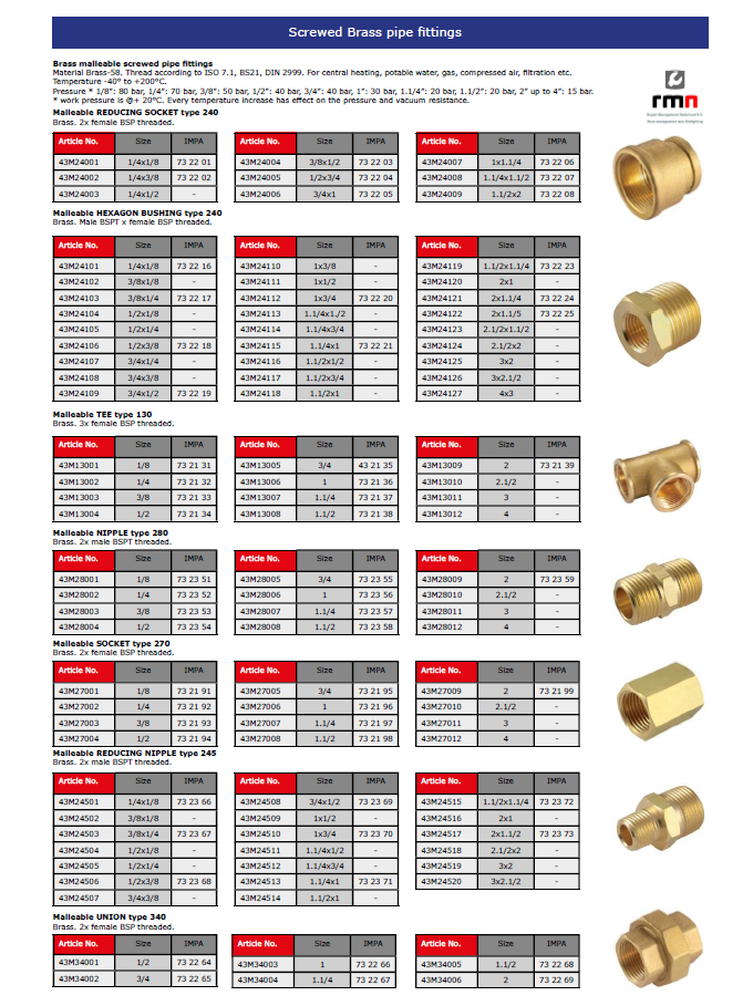 For us with central heating, compressed air, hydraulics, and other non aggresive media. Useful for copper, brass, steel and aluminium pipes and tubes. Material: MS-58-UNI 5705. Pressure range see product data sheet. Safety factor 4. Pressure depend on diameter and pipe material.