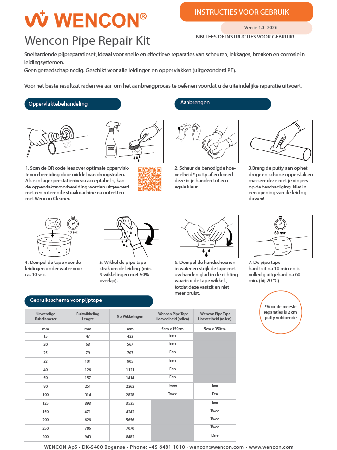 Beide Wencon Pipe Repair Kits bevatten de Wencon Pipe Tape en Wencon Putty. Met deze Kits heeft u de juiste noodoplossing bij de hand in het geval van een noodsituatie met een lekkende leiding.